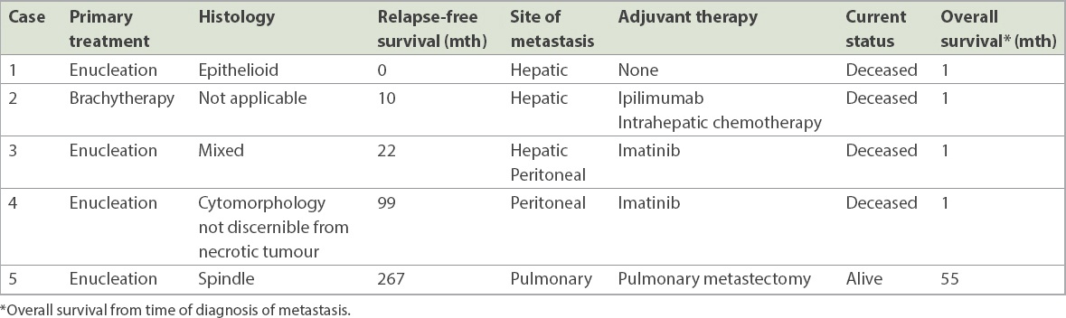 Metastatic disease developed in 45.5% of our patients, with a mean metOS of 19.8 months from diagnosis of metastasis (Table III). In one patient with metastasis who underwent genetic testing, monosomy 3 was identified. As metastatic disease is almost universally fatal, the ability to identify patients at high risk of metastasis is imperative for prognostication and selection of suitable patients for therapeutic interventional studies to alter the natural history of the disease. The chromosomal mutations that have been identified as having the greatest impact on melanoma-related metastases are 8p loss (hazard ratio [HR] 21.51, p < 0.001), 8q gain (HR 9.77, p < 0.001) and complete monosomy 3 (HR 6.68, p < 0.001).(12) Loss of BAP1 has also been implicated as a metastasis-related mutation,(11) and SF3B1 mutations are associated with late metastasis.(28) In contrast, EIF1AX-mutated tumours are associated with prolonged survival and low metastatic risk.(28) The spectrum of disease mutations in metastasising UM is rapidly expanding. Going forward, the emerging challenge is practical clinical application of these genetic prognostic factors to risk stratify and individualise surveillance protocols for early detection of metastasis, and discern if selected patients may benefit from prophylactic adjuvant systemic therapy to prevent metastasis.
