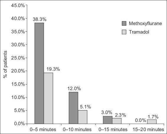 The methoxyflurane arm had a lower proportion of patients not achieving NRS reduction ≥ 3 after more than 20 minutes when compared to the tramadol arm (