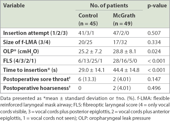 f-LMA failure occurred in 1 (2%) patient in the McGrath group and 5 (10%) patients in the control group (p = 0.204). The analysis between the two groups was conducted only in cases of successful intubation. The insertion characteristics of successful f-LMA insertion are listed in