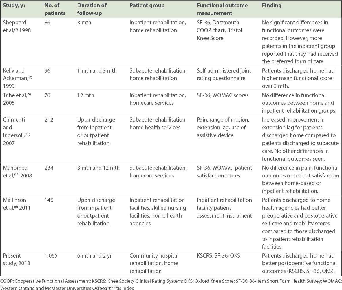 Studies in the English language literature that have compared functional outcomes following total knee arthroplasty between patients with different discharge destinations.