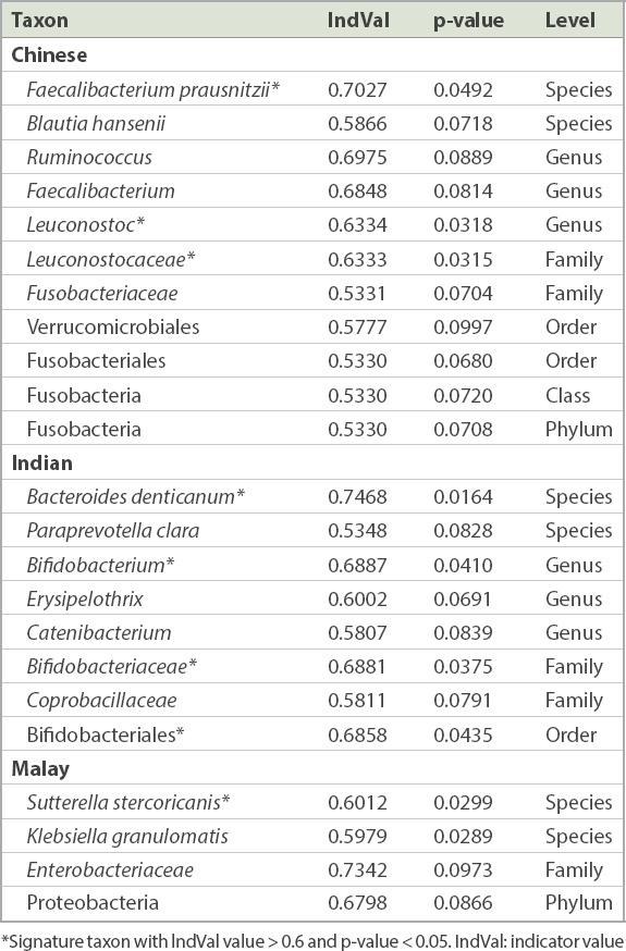 Summary of signature taxa in Chinese, Indian and Malay subjects.