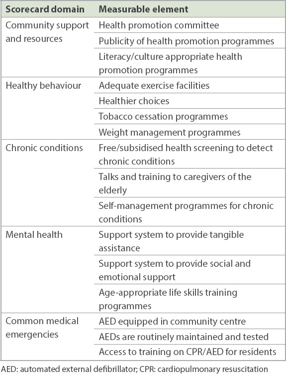 Composite scores could be used as a standardised method to evaluate health promotion programmes and ensure that they are comprehensive and evidence based. The CDC (Centers for Disease Control and Prevention) Worksite Health ScoreCard (HSC) is used to assess employers’ health promotion practices in workplaces in the United States.(10) In Singapore, we developed a similar composite health promotion scorecard after consulting experts from the Saw Swee Hock School of Public Health, National University of Singapore, and the Health Promotion Board to assess the prevalence of health-promoting practices in residential zones. The scorecard consisted of 44 measurable elements that were associated with positive lifestyle and health behaviour changes identified from a comprehensive review of the existing literature. These measurable elements were grouped under five domains: community support and resources; healthy behaviour; chronic conditions; mental health; and common medical emergencies. Each element was assigned a weightage based on the strength of evidence and its impact. Some examples of the measurable elements under each of the five domains of the composite scorecard are listed individually in Table I.(11)