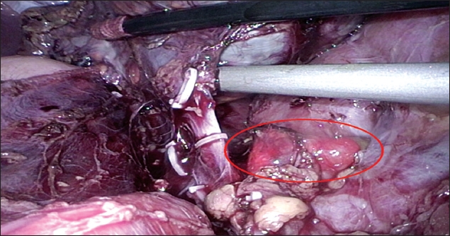 Photograph shows laparoscopic view of the accessory adrenal gland (circled).