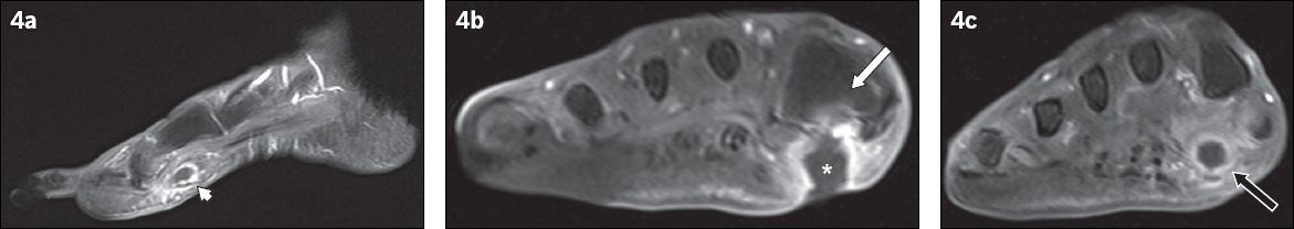 T1-weighted (T1-W) sequences depict anatomical detail well. They are sensitive to marrow changes and are the most specific in the detection of osteomyelitis. In addition, T1-W images aid in the identification of blood products. T2-weighted (T2-W) sequences are exquisitely sensitive in the detection of oedema (both bone marrow and soft tissue) and fluid collections. However, with fast spin-echo technique, the bright signal of marrow oedema may be masked by the bright signal of fatty bone marrow, potentially causing diagnostic error. Acquiring T2-W sequences with chemical fat suppression solves this problem; however, to achieve homogeneous fat suppression, the foot has to be positioned in the centre of the magnet. Short tau inversion recovery (STIR) sequence is an alternative, as it gives more uniform fat suppression due to the curvature of the foot, and at the same time remains extremely sensitive to marrow and soft tissue oedema. However, the image resolution is usually less optimal on STIR sequences.