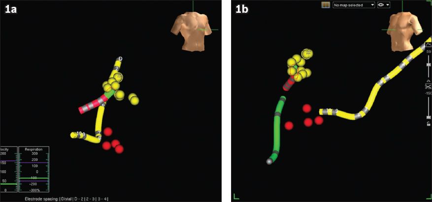 (a) Fluoroscopic and (b) EnSite NavX images show the left anterior oblique view of the heart. The correlation between the fluoroscopic and EnSite NavX images of right-sided free wall accessory pathway ablation can be seen. On the fluoroscopic image, the ablation catheter (arrow) is seen near the ‘9 o’clock’ position. On the EnSite NavX image, the red dots represent areas where radiofrequency energy has been applied. These areas correlate with the ablation catheter position on fluoroscopy. A decapolar catheter (yellow tube) was placed within the coronary sinus while a quadpolar catheter was placed in the right ventricular apex (green tube).