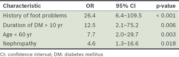 To elucidate and determine the independent risk factors of diabetic Charcot arthropathy, multivariate analysis was performed using multiple logistic regression for all significant crude ORs. A history of prior foot problems (such as foot ulcer, amputation of foot complex, surgery or a combination of these) was found to be the most preponderant predictor of diabetic Charcot arthropathy, with a 26-time higher likelihood of development of Charcot arthropathy (OR 26.4; 95% CI 6.4–109.5). Other independent predictors identified in the present study were age < 60 years, duration of diabetes mellitus > 10 years and presence of nephropathy (Table IV).