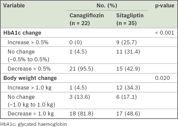 The primary endpoint of the study, which points to the effectiveness of the study drug, was change in HbA1c from baseline at the end of the 24-week follow-up. Secondary endpoints included changes in baseline body weight, systolic blood pressure, low-density lipoprotein (LDL)-cholesterol and urinary albumin-creatinine ratio by the end of the 24-week follow-up period. HbA1c change > 0.5% and body weight change > 1.0 kg from baseline were considered clinically significant in the study. The proportions of patients with significant changes in HbA1c and body weight in the two study groups were compared.