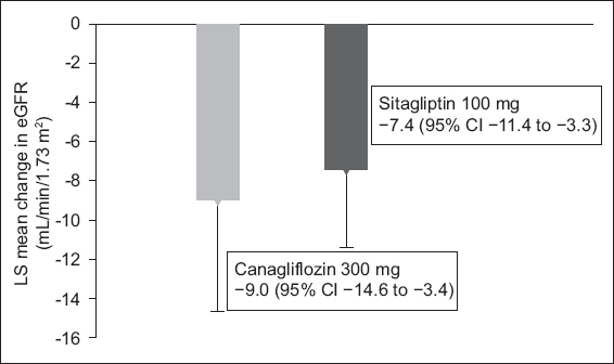 Least squares (LS) mean change graph shows change in estimated glomerular filtration rate (eGFR) in the canagliflozin 300 mg and sitagliptin 100 mg groups from baseline (p = 0.639). CI: confidence interval