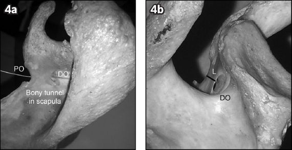Photographs show (a) the superior view of a right scapula, with a probe passing through the bony tunnel, which is located between the supraspinous notch and spinoglenoid notch; and (b) the end-on view of the bony tunnel as seen from the spinoglenoid notch to show the distal opening (DO). L: length of bony tunnel; PO: proximal opening